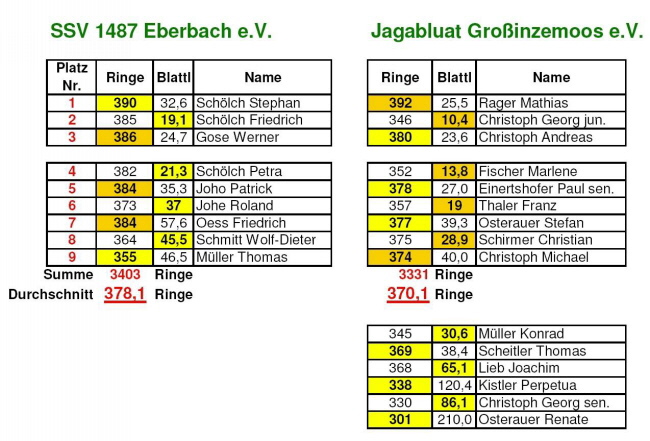 Am Ende siegte der Gastgeber Jagabluat Großinzemoos mit 529,5 Punkten gegenüber Eichengrün Riedenzhofen mit 1362,9 Punkten.